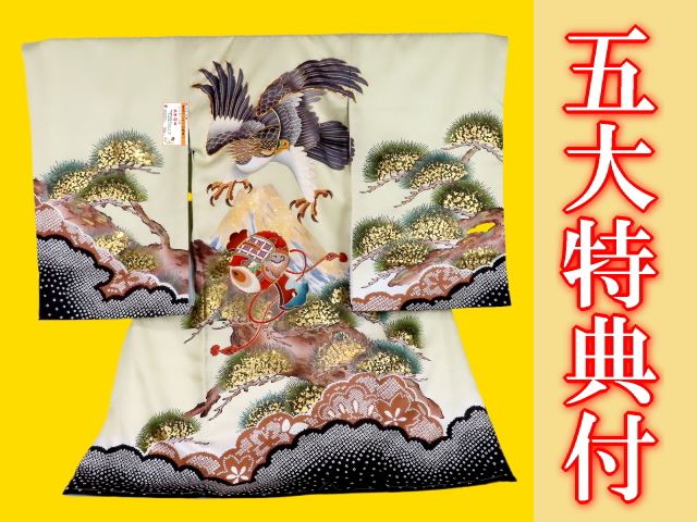 お宮参り着物正絹(初着・産着)男児G2-56 鷹に富士山・打ち出の小槌に吉祥松の柄 レモンベイジュ色地に裾黒の染絞り模様 5大特典付