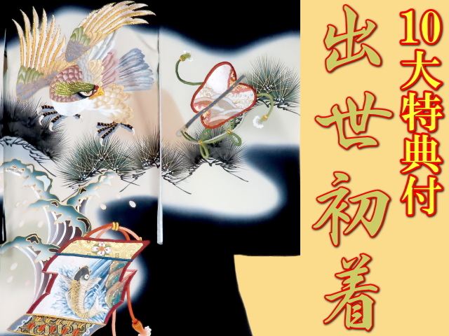 お宮参り特選着物正絹(初着・産着)男児G8-35鷹に松・鯉の滝登り軍配 黒地 10大特典付