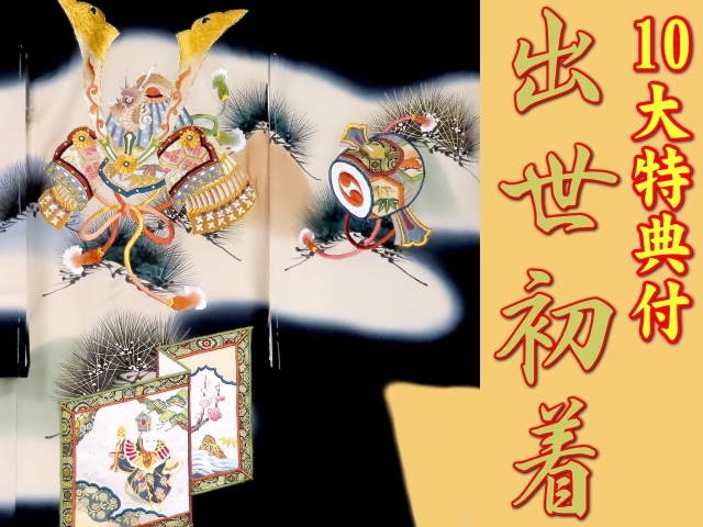 お宮参り特選着物正絹(初着・産着)男児G8-36 兜に松・打ち出の小槌柄 黒地 豪華10大特典付