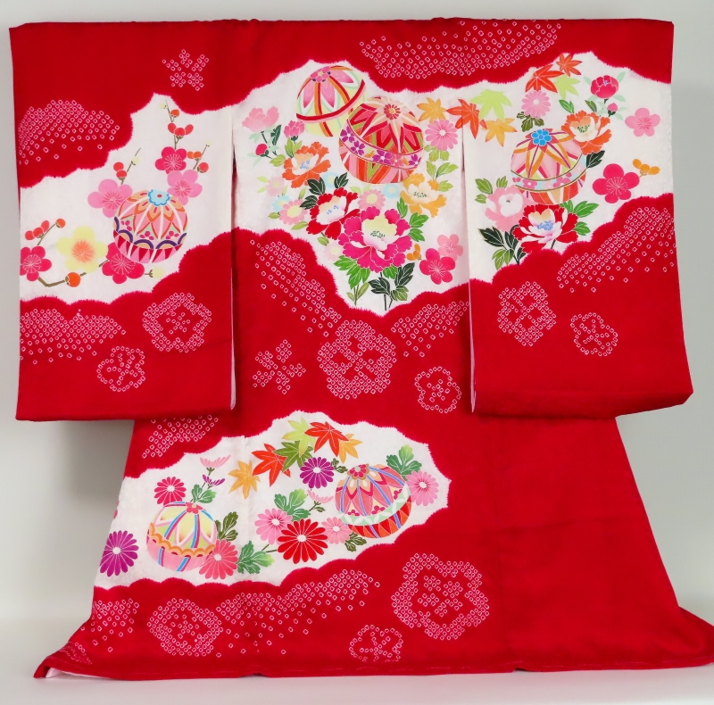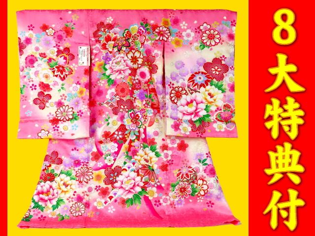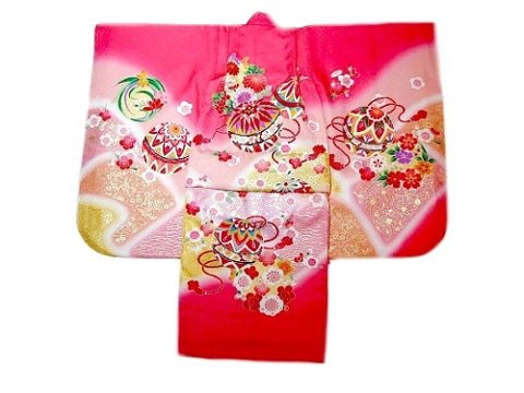お宮参り着物正絹(初着・産着)女児G7-9 手毬に熨斗目・華柄 ピンク地 8大特典付