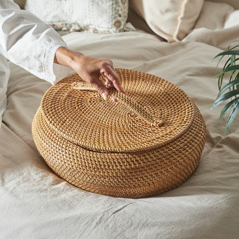 天然素材ラタンで編まれたフタつきのカゴバ...